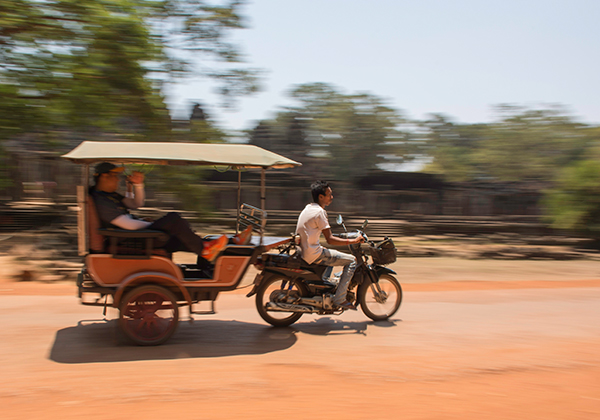 Desayuno. Empezamos con la visita de Angkor Thom. Salida en Tuk - Tuk (un tipo de motocarro, un vehículo muy típico en Camboya) hacia la puerta sur del cpmplejo, con sus impresionantes estatuas representando el movimiento del océano. La Antigua capital de Angkor Thom (Siglo XII), el templo Bayon, único por sus 54 torres decoradas con 200 caras sonrientes de Avolokitesvara, el templo Baphuon fue construido bajo el mandato de Jayavarman I, el Phimeanakas y las terrazas del rey leproso y de los elefantes, así como las cámaras reales. Continuaremos con el Ta Prohm uno de los más espectaculares templos del área, el cual se ha mantenido relativamente igual que cuando fuera descubierto y retiene todavía gran parte de su misterio. Almuerzo en restaurante local.
