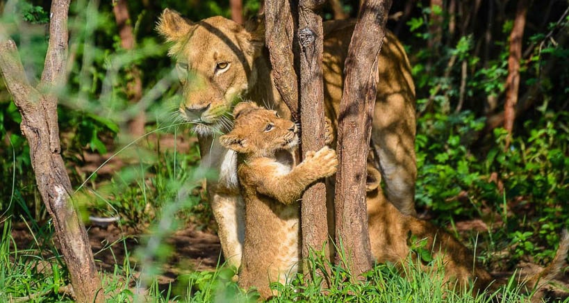 Desayuno. Safari en vehículos 4x4 por el área norte del parque hacia el lago Jorge y la aldea de Kasenyi. Aquí tendrán la oportunidad de ver leones, elefantes, hienas manchadas, antílopes de agua y antílopes cobo, quizás pueda ver un leopardo, aunque son bastante esquivos. El parque es un excelente lugar para ver animales y disfrutar de vistas panorámicas, como los lagos de cráter y el valle del Rift. Almuerzo. Por la tarde realizaremos una excursión en barco por la península de Mweya en el canal de Kazinga, uno de los sitios más bellos de Uganda por su concentración de vida selvática. Durante esta excursión verán especies de aves endémicas, y también hipopótamos, búfalos y elefantes. Salida por carretera hacia Ishasha. Cena y alojamiento en el Lodge.