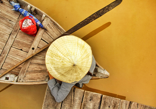 A su llegada, tomaremos un barco que nos llevará a través de los estrechos canales, rodeados de una densa vegetación hasta el corazón del Delta. Es un mundo completamente diferente donde la vida se desarrolla alrededor del río. A lo largo del día, podrán degustar muchos de estos productos locales, como frutas exóticas y autóctonas cultivadas en los huertos del Delta, los caramelos de coco, elaborado en fábricas familiares. Volveremos a la orilla realizando un paseo con un tipo de vehículo típico en la zona y posteriormente tomando una embarcación a remo, a través de los canales densos en vegetación. Almuerzo en un restaurante local.